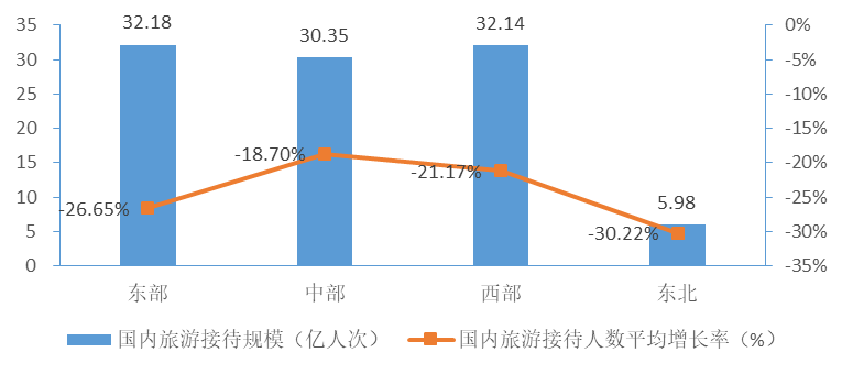 我国东部、中部和西部区域延续了近十年来的收敛趋势,中西部区域的国内旅游接待人数增长速度更快(下降速度更慢),与东部区域的发展差距不断缩小。2020年东部、中部和西部的国内旅游接待人数分别为32.18亿人次、30.35亿人次、32.14亿人次,未来中部和西部区域的国内旅游接待人数有可能超过东部区域。东北区域的国内旅游接待人数为5.98亿人次,且受疫情影响下降幅度最大,与其他区域有较大差距。