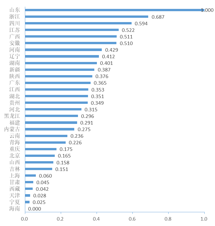 综合测算旅游景区的规模和吸引力后得到各地区的旅游景区发展指数,山东、浙江、四川、江苏、广西和安徽等省区位居全国前列,旅游景区体系产生较强的旅游吸引力。甘肃、西藏、天津、宁夏、海南等省区市具有丰富的自然生态资源和历史文化资源,但旅游景区发展指数较低,未来应在自然资源的可持续利用、传统文化的创造性转化和创新性发展上进一步提升。