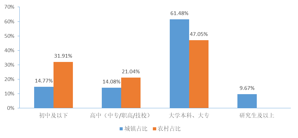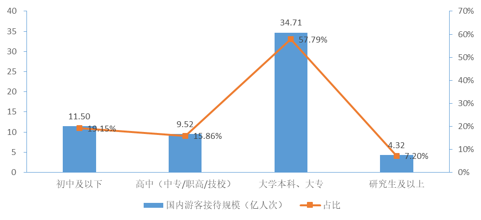 从城乡国内旅游者的分受教育程度比重来看,城镇国内旅游者的受教育程度显著高于农村国内旅游者,大学本科、大专及以上学历的国内旅游者占比达到71.15%。
