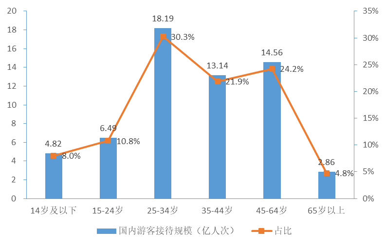 依据最新的国内旅游抽样调查资料,2019年国内旅游的最主要群体是25-34岁的青年人,占旅游者总量的30.3%。25-44岁的中青年旅游者合计占到国内旅游者总量的52.2%。