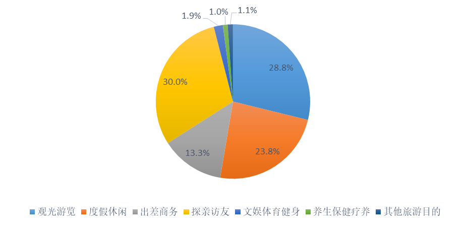城镇居民的国内旅游目的以探亲访友为主,占30.0%;其次是观光游览,占28.8%;再次是度假休闲,占23.8%。