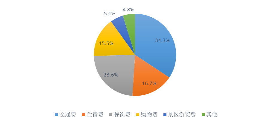 2019年城镇散客旅游者的出游花费中,交通费所占比重最高,达到了34.3%;其次是餐饮费,占到了23.6%;再次是住宿费,占到了16.7%。