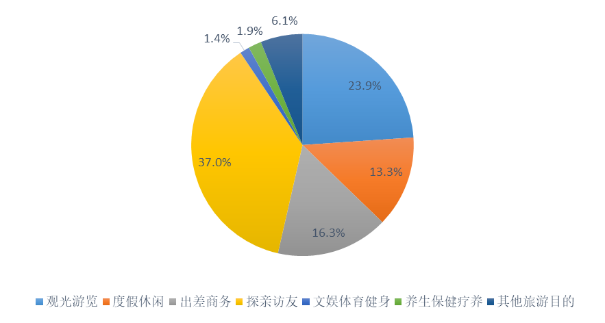 农村居民的国内旅游目的以探亲访友为主,占37.0%;其次是观光游览,占23.9%;再次是商务出差,占16.3%。