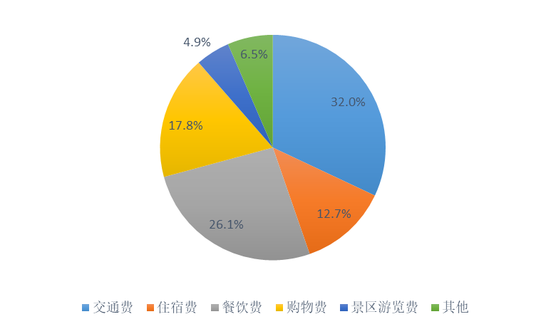 2019年农村散客旅游者的出游花费中,交通费所占比重最高,达到了32.0%;其次是餐饮费,占到了26.1%;再次是购物费,占到了17.8%。