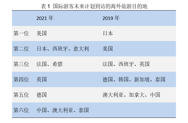 中国旅游研究院与谷歌联合开展的潜在来华游客的旅游意向与态度调查显示:如果未来两年疫情得到有效遏制,全球普遍放开边境限制,有8%的海外民众考虑来华旅游。在全球游客计划到访的海外旅游目的地排名中,中国排在第6位。与具有潜在竞争关系的其他亚太目的地相比,我国虽然与日本还存在一定差距,但与韩国、新加坡和泰国等相比,海外旅游吸引力有所回升。