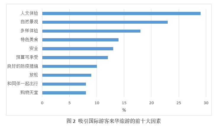 人文体验是吸引国际游客来华的主要因素。其次是自然景观、多样体验和特色美食。良好的防疫措施是国际游客选择来华时需要考虑的新因素。