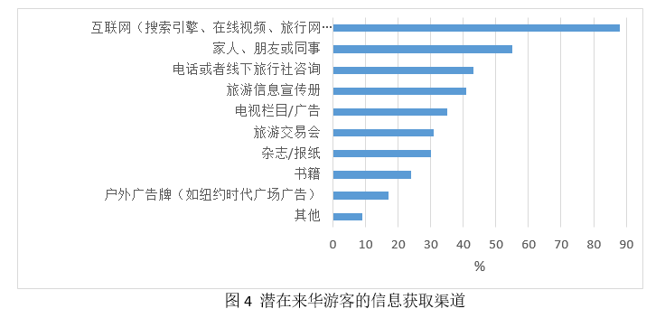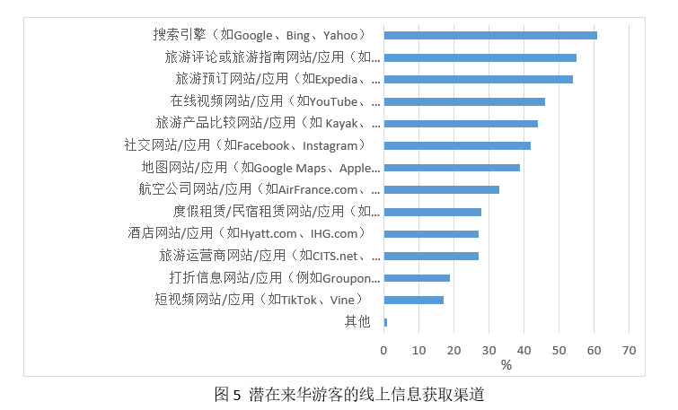 在所有在线信息渠道中,潜在来华游客使用最多的是搜索引擎、旅游评论网站和旅游预订网站。