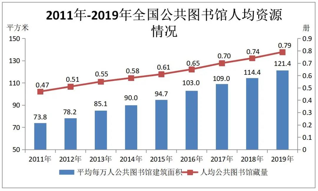 年末全国平均每万人公共图书馆建筑面积121.4平方米,比上年末增加7.0平方米;全国人均图书藏量0.79册,比上年末增加0.05册;全年全国人均购书费1.68元,比上年末减少0.09元。