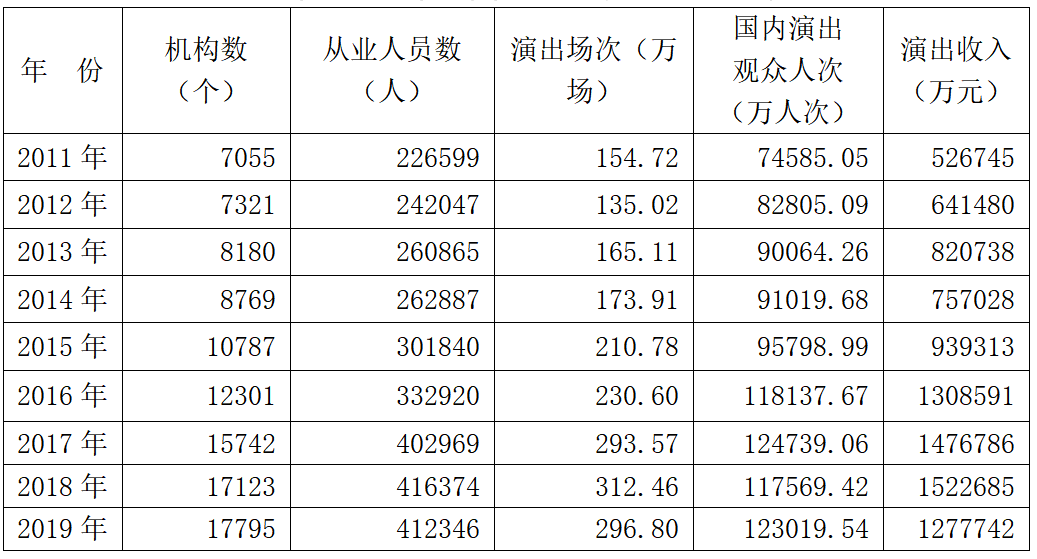 年末全国共有艺术表演团体17795个,比上年末增加672个,从业人员41.23万人,比上年末减少0.42万人。其中各级文化和旅游部门所属的艺术表演团体2051个,占11.5%,从业人员11.33万人,占27.5%。