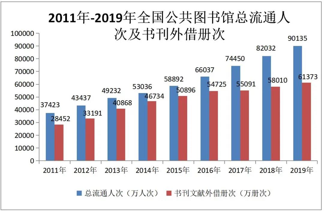 全年全国公共图书馆发放借书证8627万个,比上年增长18.8%;总流通人次90135万,增长9.9%。书刊文献外借册次61373万,比上年增长5.8%;外借人次26609万,比上年增长3.1%。全年共为读者举办各种活动195732次,比上年增长9.3%;参加人次11786万,比上年增长10.7%。