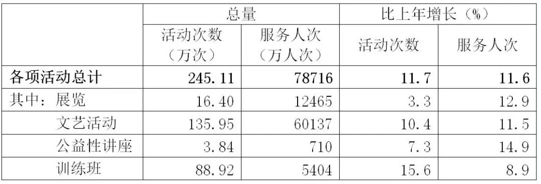 全年全国群众文化机构共组织开展各类文化活动245.11万场次,比上年增长11.7%;服务人次78716万,比上年增长11.6%。