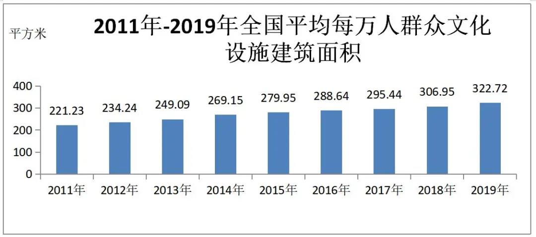 年末全国群众文化机构实际使用房屋建筑面积4518.18万平方米,比上年末增长5.5%;业务用房面积3295.21万平方米,比上年末增长4.7%。年末全国平均每万人群众文化设施建筑面积322.72平方米,比上年末提高15.77平方米。