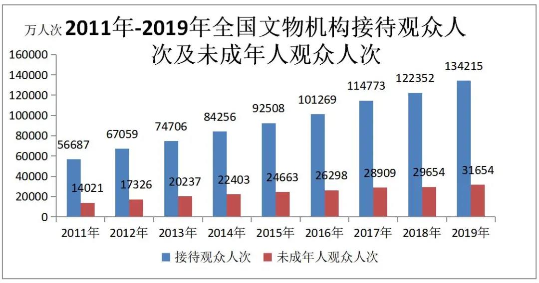 2019年全国各类文物机构共举办陈列展览30728个,比上年增加2809个。其中,基本陈列15038个,比上年增加1362个;临时展览15690个,比上年增加1447个。接待观众134215万人次,比上年增长9.7%,其中未成年人31654万人次,增长6.7%,占参观总人数的23.6%。博物馆接待观114732万人次,比上年增长9.9%,占文物机构接待观众总数的85.5%。