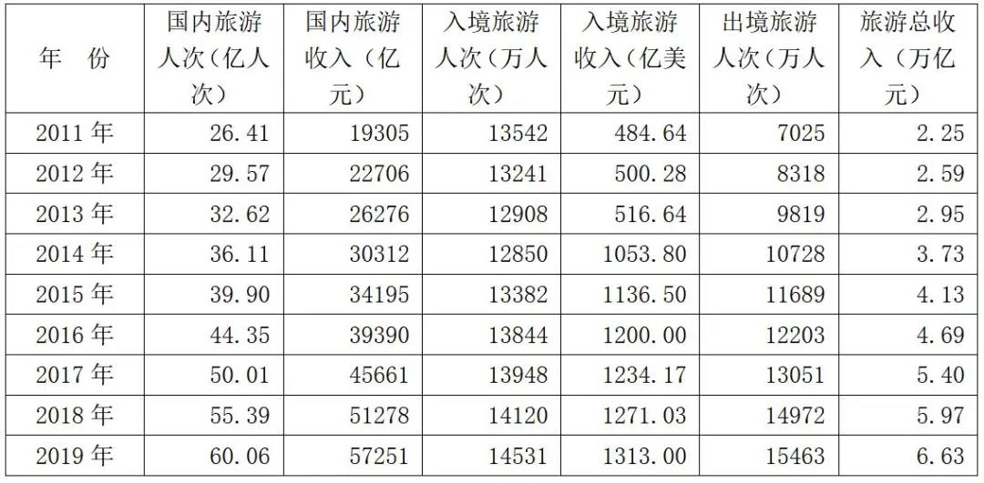 2019年国内旅游市场和出境旅游市场稳步增长,入境旅游市场基础更加牢固。全年国内旅游人数60.06亿人次,比上年同期增长8.4%;入境旅游人数14531万人次,比上年同期增长2.9%;出境旅游人数15463万人次,比上年同期增长3.3%;全年实现旅游总收入6.63万亿元,同比增长11.1%。