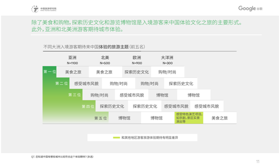 美食购物,探索历史文化和游览博物馆是外国入境游客来中国体验文化之旅的主要形式。不同大洲的游客对中国文化体验也有偏重,亚洲游客期待感受现代的城市文化,欧洲游客对传统中国历史文化更有兴趣,同时他们期待传统特色演艺项目,如京剧等。