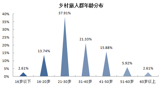 青壮年为乡村游的主流群体,其中21-30岁占比37.91%,31-40岁占比21.33%;16-20岁及41-50岁旅游群体比例相当。
