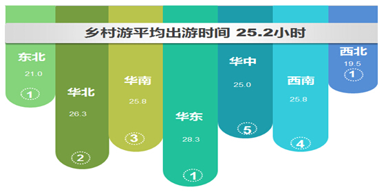 乡村游平均出游时间为25.2小时,其中出游时间最长和最短的分别为上海和新疆地区游客,其乡村游出游时间分别为37小时和12小时。分区域来看,华东地区游客出游持续时间最长,为28.3小时,西北地区最短,为19.5小时。