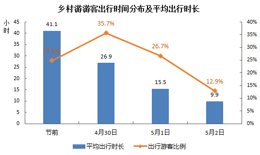 出于错峰出游、避开出城拥堵等方面的原因,“五一”小长假期间约24.9%的乡村游游客选择在4月30日之前离开其惯常环境,这部分游客出游时间最长,平均达41.1小时。而放假第一天出游的人最多,占到35.7%,其平均出游时间次长,为26.9小时。仍有12.8%的游客会在假期最后一天体验乡村旅游,不过该天出游游客的平均出游时间最短,为9.9小时。