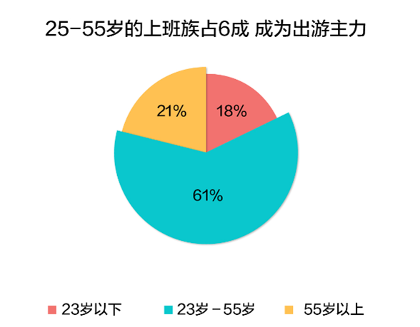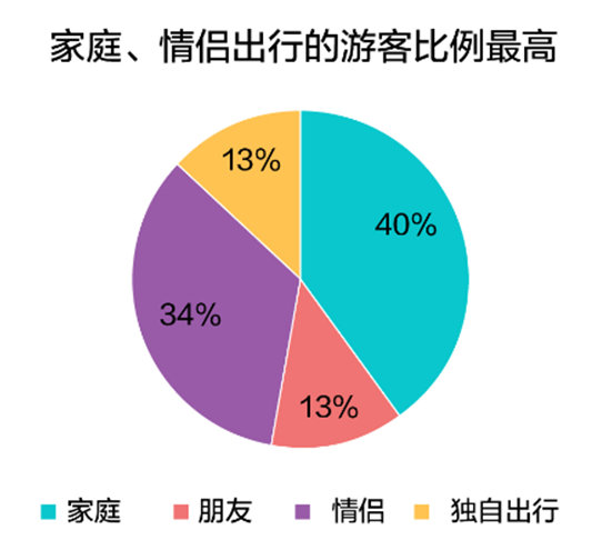从出游人群看,上班族、家庭、女性成为关键词。从携程旅游客户的大数据来说,平时假期有限的上班族在黄金周集中“爆发”,年龄段在23-55岁之间的群体占到出游总人数的6成以上。90、00后崛起,占比18%。55岁以上的中老年人也习惯通过网站报名,占了21%。女性游客成为出游主力,占比59%比男性高18个百分点,女性主导旅游的时代来临。他们倾向于和谁一起度过假期?家庭和情侣出行的比例最高,分别占比40%和34%。