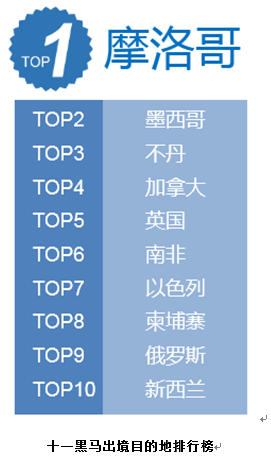 报告还发布了国庆出境游十大黑马目的地:摩洛哥、墨西哥、不丹、加拿大、英国、南非、以色列、柬埔寨、俄罗斯、新西兰。其中,大部分是受到免签、落地签等利好政策的刺激。国庆前新增的免签落地签目的地包括摩洛哥、津巴布韦、厄瓜多尔、汤加等,而简化或放宽对华签证政策的国家包括英国、阿根廷、马来西亚、以色列、南非等,这些国家都成功跻身十一黄金周出境游黑马排行榜。从携程签证办理数据看,摩洛哥收客同比增长3500%,英国、柬埔寨、俄罗斯、新西兰则成为热门目的地中增长最快的,增幅最高达60%以上。