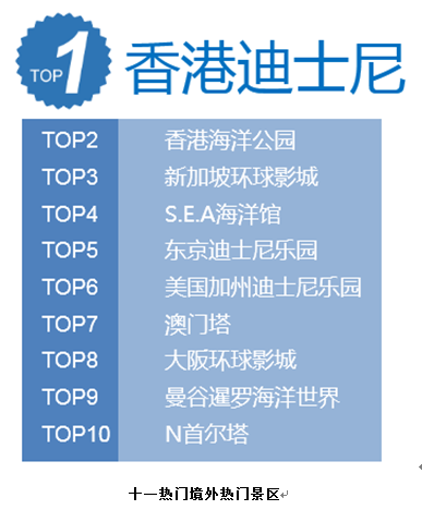 境外景区门票方面,香港迪士尼乐园、香港海洋公园、新加坡环球影城、S.E.A海洋馆、美国加州迪士尼乐园、澳门塔、大阪环球影城、曼谷暹罗海洋世界、N首尔塔最热。全球迪士尼乐园成为大赢家。
