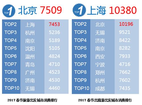 从客源地人均消费来看,2017年春节,通过携程预订跟团游、自由行产品,人均消费最高的城市分别是北京、上海、杭州、南京、沈阳、温州、青岛、广州、济南、无锡;出境游消费最高的城市是上海、北京、无锡、济南、南京、西安、宁波、郑州、杭州、成都。