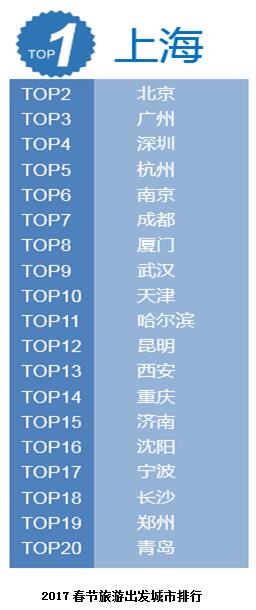 今年春节,哪些地区的市民最热衷外出旅游?出发地人气排行榜显示,出游人数排名前20的城市是:上海、北京、广州、深圳、杭州、南京、成都、厦门、武汉、天津、哈尔滨、昆明、西安、重庆、济南、沈阳、宁波、长沙、郑州、青岛。
