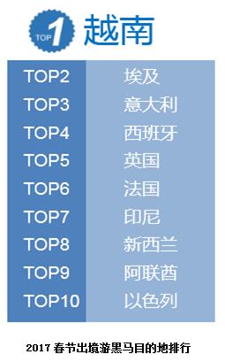 越南、埃及、意大利、西班牙、英国、法国、印尼、新西兰、阿联酋、以色列成为2017年春节出境游十大黑马目的地,其中前9个都是长线国家。从增加人数来看,越南成为今年春节最大的黑马。欧洲目的地经过一年多的恢复,已经全面回暖,春节赴法国、英国、意大利、西班牙等国家游客同比增长100%以上。