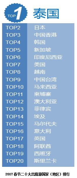春节出境都去哪儿了?根据携程跟团游、自由行、邮轮等出境业务数据,2017春节人气排名前二十的出境游国家(地区)依次是:泰国、日本、中国香港、韩国、新加坡、印度尼西亚、美国、越南、中国台湾、马来西亚、柬埔寨、澳大利亚、菲律宾、埃及、马尔代夫、意大利、英国、阿联酋、西班牙、斯里兰卡。