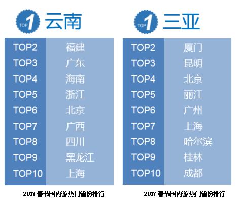 近日,中国旅游研究院、携程旅行网,基于今年春节全国旅游市场情况、携程旅行网超过2.5亿用户群体数据,对春节假期的旅游情况和游客行为进行了全面监测,发布了《2017春节旅游趋势报告与人气排行榜》,包括今年旅游人次、消费规模、最热门的出发城市、目的地省市、国家和地区、旅游方式等。