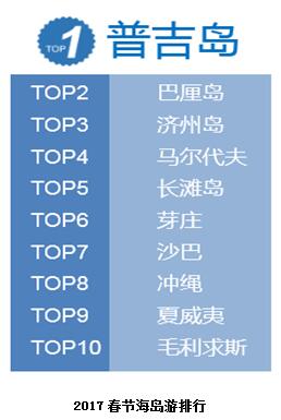 报告认为,2017年国人春节出游节奏更慢,从旅游观光到度假体验,海岛游人次占春节出境游的30%左右。春节十大热门出境海岛包括普吉岛、巴厘岛、济州岛、马尔代夫、长滩岛、芽庄、沙巴、冲绳、夏威夷、毛里求斯。