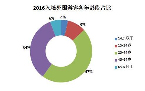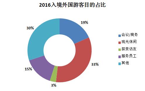 2016全年,入境外国游客人数3148 万人次【1】,亚洲占67.5%,美洲占10.7%,欧洲占17.3%,大洋洲占2.6%,非洲占1.9%,其他国家占0.0%。其中:按照年龄分,14岁以下人数占3.6%,15-24岁占9.6%,25-44岁占46.8%,45-64岁占34.3%,65岁以上占5.7%;按性别分,男性占63.0%,女性占37.0%;按目的分,会议/商务占18.4%,观光休闲占33.4%,探亲访友占3.1%,服务员工占15.0%,其它占30.1%。