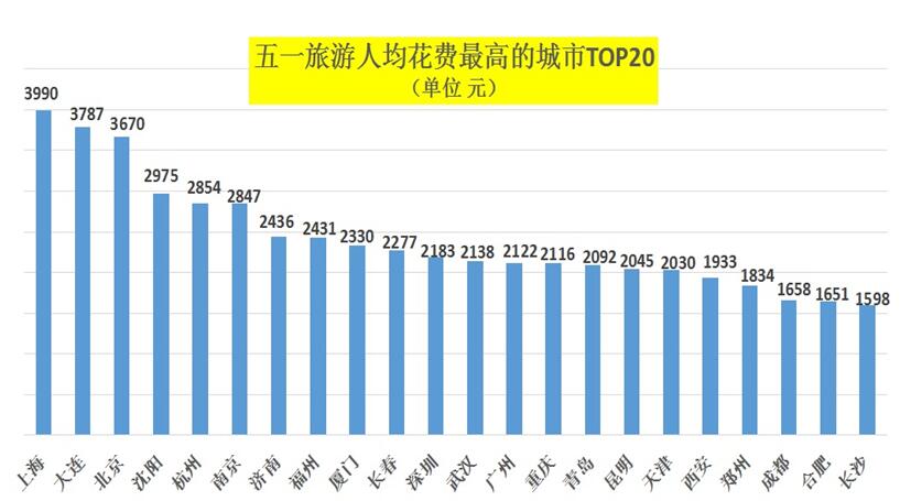 中国旅游研究院、携程旅游专家研究发现,从人均消费看,在线度假旅游者“五一”人均花费近3000元。综合携程的国内游、出境游大数据,报告发布了2017年“五一”人均旅游花费最高的20大城市,依次是:上海、大连、北京、沈阳、杭州、南京、济南、福州、厦门、长春、深圳、武汉、广州、重庆、青岛、昆明、天津、西安、郑州、成都、合肥、长沙。