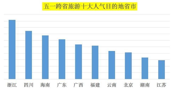“五一最具人气旅游省市”排行榜显示,从在线预订跟团游、自由行等度假产品的人数看,到达游客最多的前十大省市依次是:浙江、四川、海南、广东、广西、福建、云南、北京、湖南、江苏。浙江排名居首,其次是四川、海南。