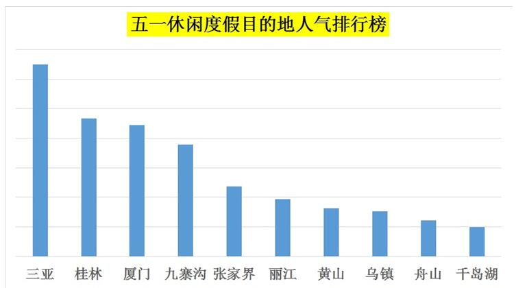 “五一最具人气休闲度假目的地”排行榜显示,从在线预订自由行、一地深度游等产品的人数看,游客选择最多的前十大休闲度假目的地依次是:三亚、桂林、厦门、九寨沟、张家界、丽江、黄山、乌镇、舟山、千岛湖。这些都属于可以住下来慢慢体验的目的地,以海岛度假闻名的三亚位居第一。