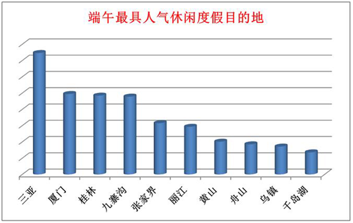 “端午最具人气休闲度假目的地”排行榜显示,从在线预订自由行、一地深度游等产品的人数看,游客选择最多的前十大休闲度假目的地依次是:三亚、厦门、桂林、九寨沟、张家界、丽江、黄山、舟山、乌镇、千岛湖。这些都属于可以住下来慢慢体验的目的地,以海岛度假闻名的三亚位居第一,其次是厦门、桂林。