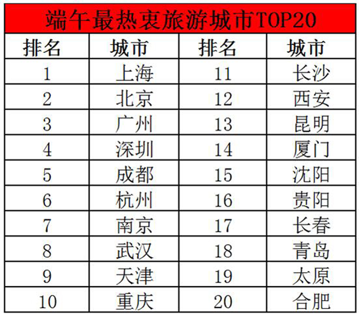今年“端午”哪些地方的市民旅游最积极?根据在线预订携程旅游产品的人数, 2017“端午”20大旅游出发人气城市分别为:上海、北京、广州、深圳、成都、杭州、南京、武汉、天津、重庆、长沙、西安、昆明、厦门、沈阳、贵阳、长春、青岛、太原、合肥。