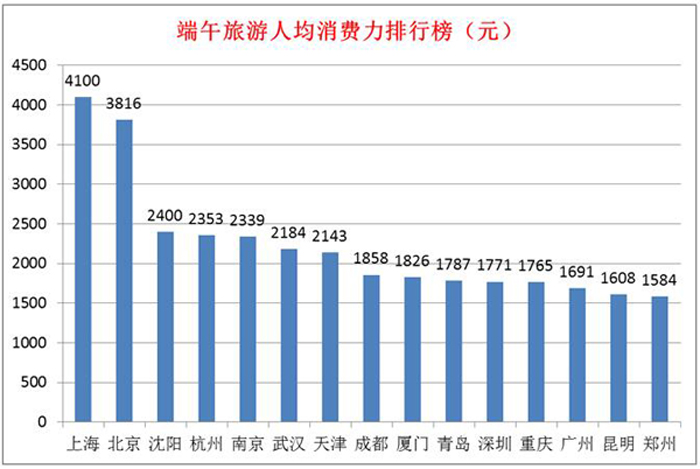 携程网在线订单统计显示,“端午”度假旅行人均花费约2500元。2017年“端午”人均旅游花费最高的15大城市依次是:上海、北京、沈阳、杭州、南京、武汉、天津、成都、厦门、青岛、深圳、重庆、广州、昆明、郑州。
