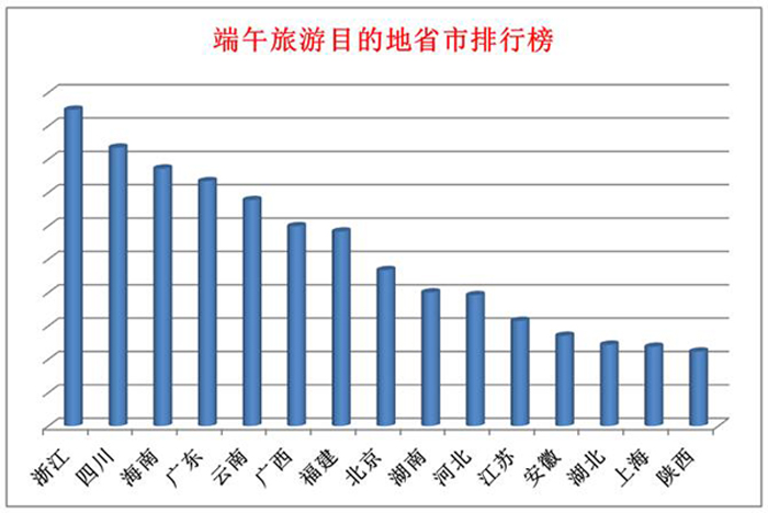“端午最具人气旅游省市”排行榜显示,从在线预订跟团游、自由行等度假产品的人数看,到达游客最多的前十五大省市依次是:浙江、四川、海南、广东、云南、广西、福建、北京、湖南、河北、江苏、安徽、湖北、上海、陕西。