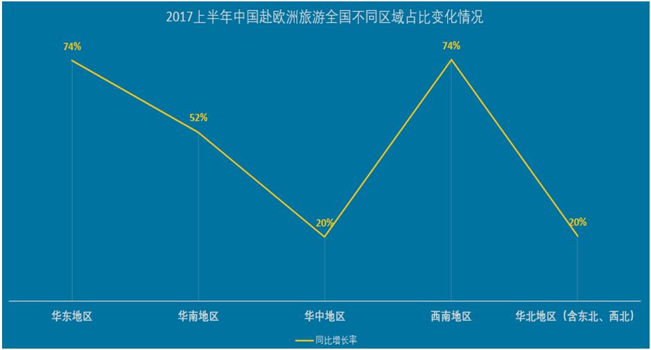 从全国不同区域人群出游习惯与偏好的差异性分析发现:华东市场的客源比重高达到50%,同比增速达到74%,市场占有和同比增速双指标均实现全国领先。华北和华南区域市场容量接近,中西部地区由于受经济发展水平等因素制约,其欧洲游占比相对较低,但市场潜力正逐步显现,其中西南市场的增速高达74%,接近华东市场。