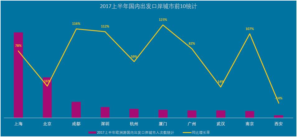 意大利、法国、德国、英国、瑞士、俄罗斯、西班牙、葡萄牙、土耳其、捷克是中国游客选择最多的前十大出境目的地国家。巴黎、罗马、法兰克福、伦敦、莫斯科、布拉格、里斯本、雅典、米兰、巴塞罗那成为前十大人气出境目的地城市。布拉格、维也纳、莫斯科、阿姆斯特丹、赫尔辛基及马德里,2017年都倍受中国游客青睐,游客增速较高。