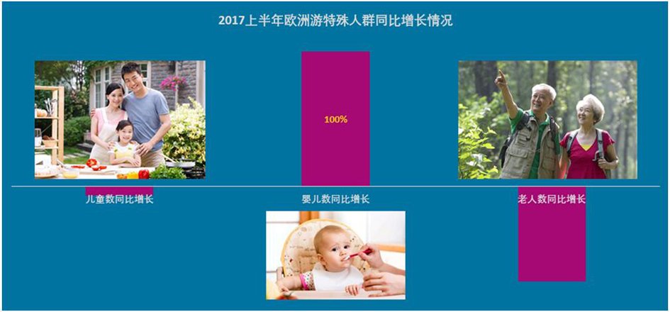 2017上半年中国赴欧洲旅游实现了65%的同比增长率,其中跟团游人群增长81%,目的地跟团游增长103%,跟团游依然是欧洲游的主要出游方式;而在欧洲游市场中占比尚不算高的自由行人群也实现了同比26%的增长。相对2016年度的市场低靡状况,2017上半年的市场表现让大家对未来有更好的预期。