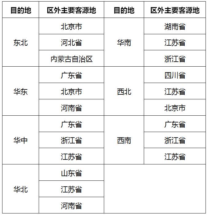 春节期间,返乡流、探亲流、旅游流、学生流叠加,中程客流为主。城市商业街区、博物馆、主题公园、游乐场、动物园、庙会等场所节日氛围浓厚,看电影、购物、聚餐、儿童游乐等将逐渐上升。根据数据中心与中国电信旅游大数据联合实验室的监测数据,每个区域的客源以本区域为主,区域外客源以中程游客为主(见表1)。华中和华东、华南和西南地区游客接待量领先,四个区域将占全国游客接待比例近八成。从省域尺度看,预计接待游客规模最大的十个省份依次是四川、江苏、广东、湖南、安徽、河南、湖北、河北、江西和广西。