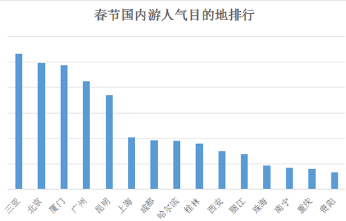 根据携程国内游订单数据,今年春节旅游人气持续上升,南方海岛、温暖城市、冰雪景点最受游客喜爱。三亚、北京、厦门依然非常火爆,广州、昆明紧随其后,上海、成都、哈尔滨、桂林等城市也不甘示弱。