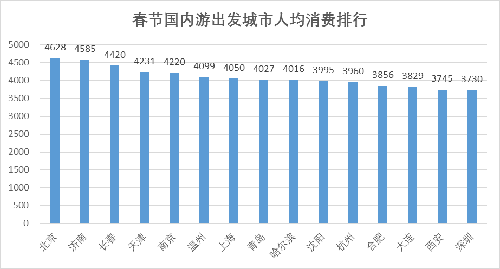 根据数据中心与携程旅游大数据联合实验室的监测数据,北京以人均消费超过4600元占领国内游消费榜榜首,济南、长春、天津、南京、温州、上海、青岛、哈尔滨、沈阳等地依次获得2至10名。北京人无论国内游还是出境游,获得“最舍得花钱”的称号当之无愧,同样具有高购买力的上海人则偏爱出境游。