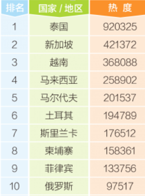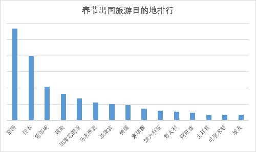 受人民币汇率持续升值、签证、交通更加便利影响,出境游仍然是春节旅游清单的重要一项。根据携程出境游订单数据,泰国、日本成为最受中国游客欢迎的目的地,新加坡、越南、印度尼西亚、马来西亚、菲律宾、美国、柬埔寨、澳大利亚则依次获得第3至第10名国家。
