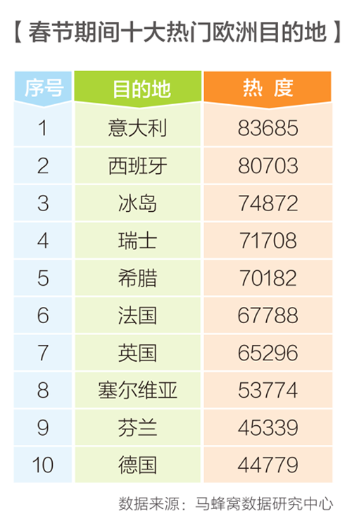 中欧旅游年,意大利最受欢迎。根据数据中心与马蜂窝自由行大数据联合实验室监测数据,2018年春节期间,意大利的自由行产品价格同比去年春节期间下降18%,最受中国游客欢迎。滑雪是冬季出游的热门主题,因此拥有200 多个滑雪场的瑞士,其热度位列第四。