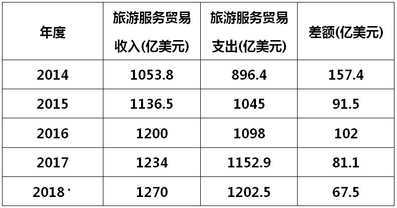 以上支出均应从我国国际收支平衡表旅行支出项予以扣减,才可视为符合国际社会统计规则的旅游服务贸易支出。结合中国旅游研究院按季度开展的出境旅游调查中游客花费调查,得到2014年-2017年我国旅游服务贸易支出分别约为896.4亿美元、1045亿美元、1098亿美元和1152.9亿美元,预计2018年达1202.5亿美元。与此同时,2017年,我国国际收支平衡表旅行项收入约387亿美元,因漏算大量持内地银行卡的港澳高频游客花费,和数千万搭乘我国航空公司航班入境游客的机票支出,无法真实反映旅游服务贸易收入,不具参考价值。国家旅游局联合国家统计局参照国际社会针对入境游客的抽样调查方法,制定出台《旅游统计调查制度》共全国旅游系统规范执行,得出2017年我国旅游服务贸易收入约为1234亿美元。同理算的2014-2016年我国旅游服务贸易收入数据,分别为1053.8亿美元、1136.5亿美元和1200亿美元,预计2018年该数据将达1270亿美元。