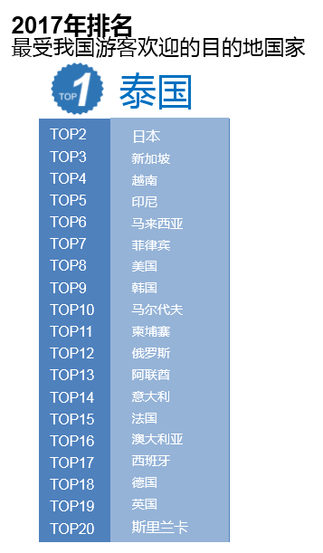 报告根据携程出境游预订数据,发布了2017年最受中国游客欢迎的二十大目的地国家,依次是:泰国、日本、新加坡、越南、印尼、马来西亚、菲律宾、美国、韩国、马尔代夫、柬埔寨、俄罗斯、阿联酋、意大利、法国、澳大利亚、西班牙、德国、英国、斯里兰卡。