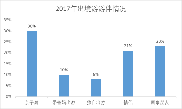 出行游伴方面,亲子游依旧比重最高,占比30%。带爸妈出游逐渐成为孝亲礼,占比10%,出游时间集中在节假日。携程数据显示,2017年独自出游的占比为8%,旅游成为单身男女最热衷的休闲和消费方式之一。